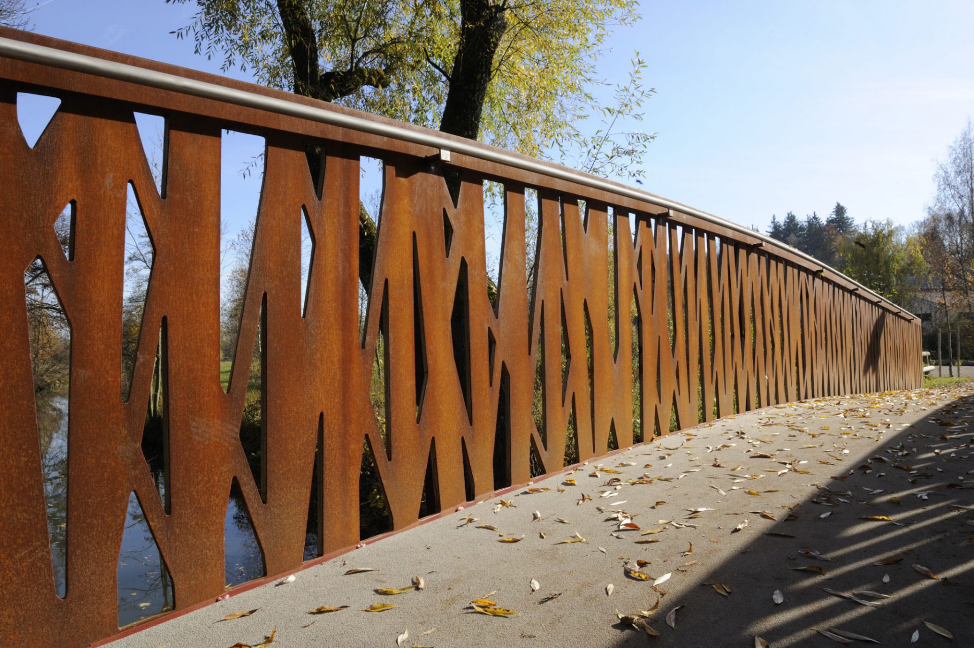 Der Fußgängersteg verbindet das neue Rathaus mit dem östlichen Ortsbereich auf kurzem Weg abseits der Hauptverkehrsstraßen. Durch die Lage im Überschwemmungsbereich und die unmittelbar angrenzenden Bäume sollte der Weg vor der Brücke möglichst wenig angehoben werden.Bei der gewählten Brückenkonstruktion liegt dieLauffläche nur 12 cm über dem gefor-derten Brückendurchlass.Die Stahlkonstruktion des Steges hat einen U-förmigen Trogquerschnitt, wobei die transparenten Geländer eine tragende Funktion übernehmen. Die Seitenwangen des Stegs bestehen aus20mm starken Blech. Die Gehwegoberfläche wird mit einem reaktionsharzgebundenen Dünnbelag auf Stahl mit einer Quarzsandeinstreuung ausgeführt.