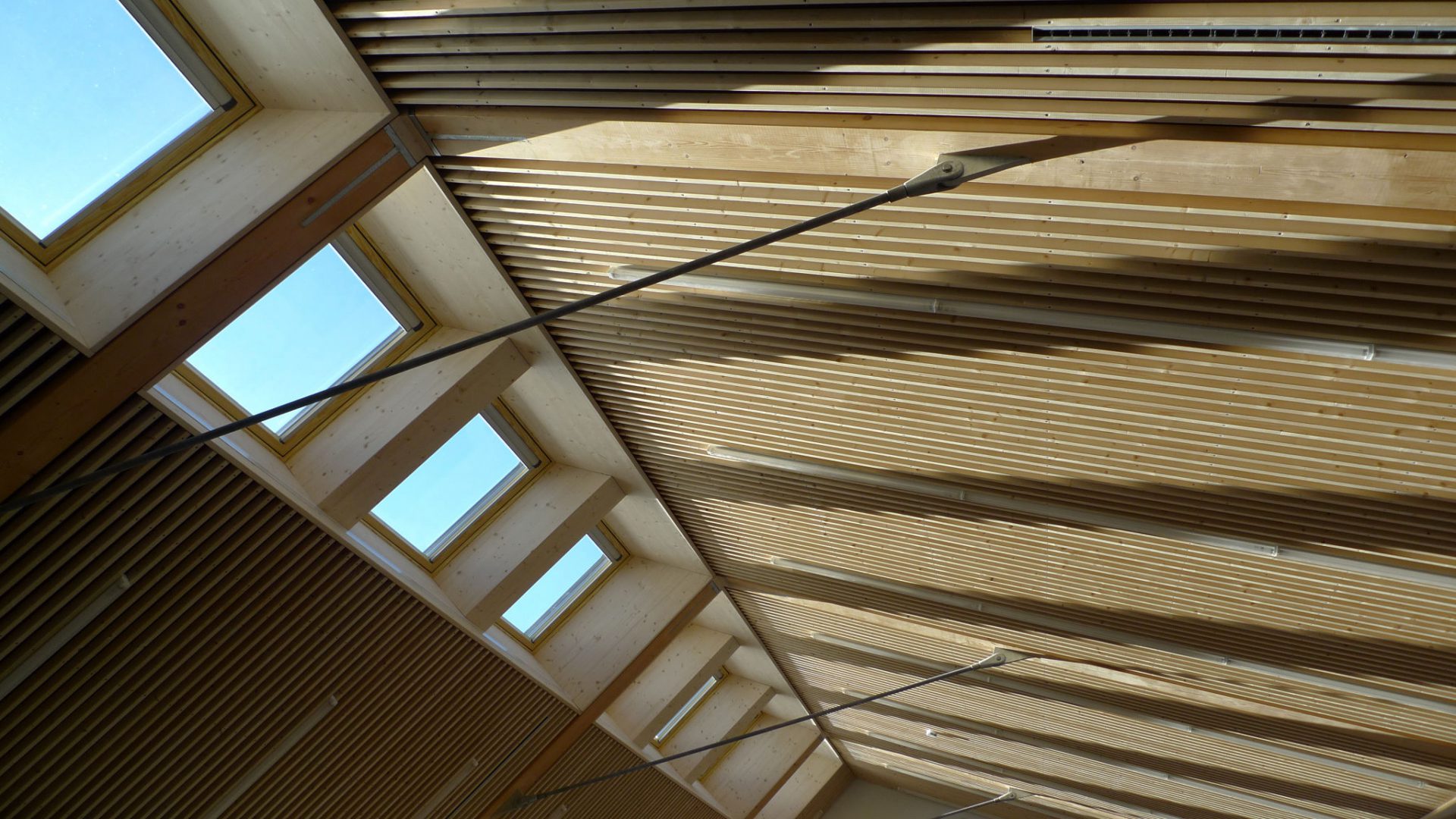 Ein öffentliches Treppenhaus mit Aufzug an der attraktiven Gebäudeseite im Westen inszeniert mit großem Fenster den Ausblick auf die Kirche und erleichtert die Erreichbarkeit der Einrichtungen von den beiden Geländeebenen, vom Platz und vom Kirchenweg.