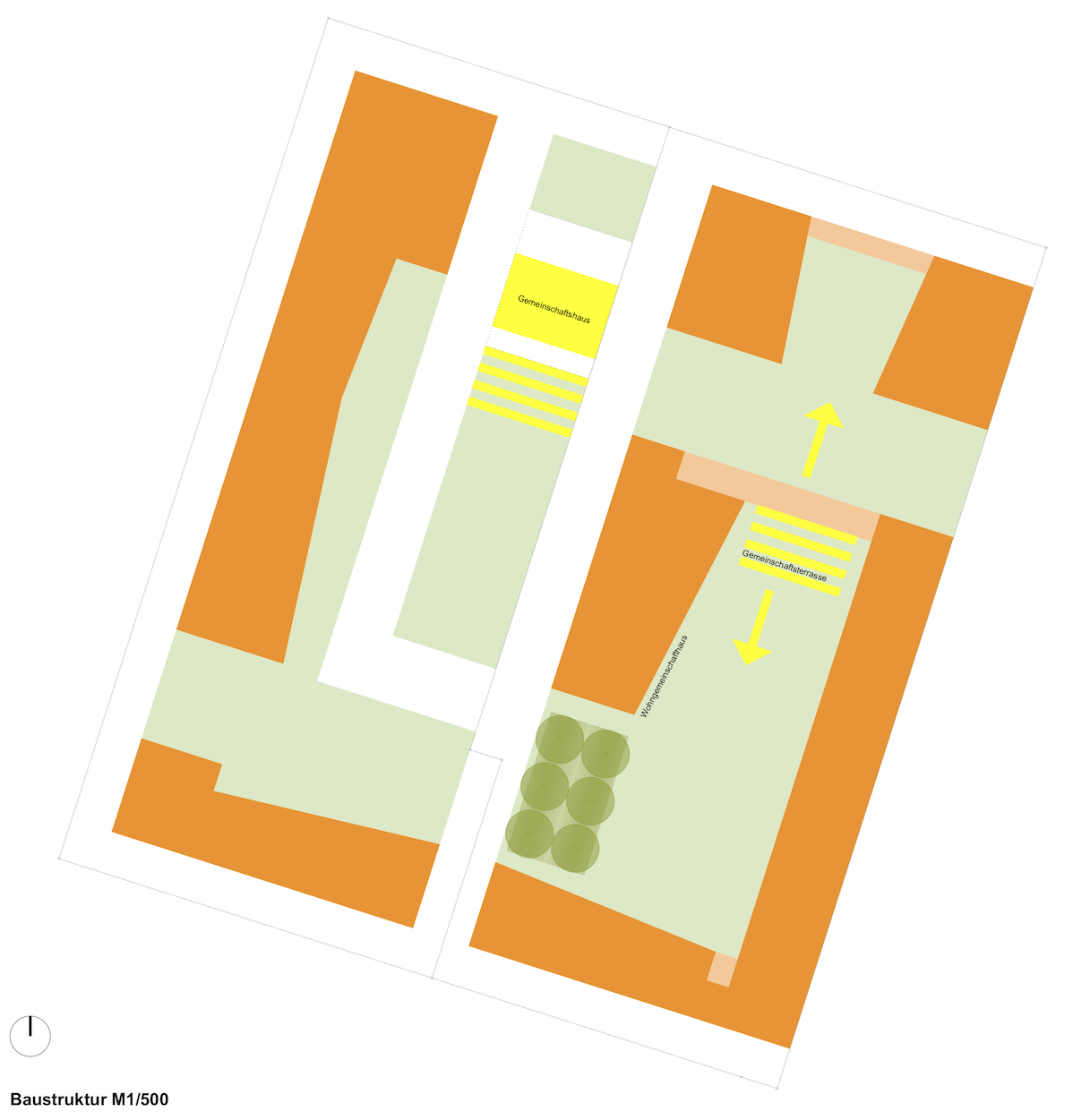 Die Gebäudestruktur mit klarer Definition der äußeren und inneren Raumkanten folgt dem Bebauungsplan und bindet die 3-geschoßigen Gebäuden der benachbarten Genossenschaft räumlich ein. Die zentrale Mitte des Wohnclusters bildet der autofreie Wohn- und Erschließungshof mit gemeinschaftlichen Spiel- und Gartenflächen. Zur Straße im Norden schafft ein Holzpavillon (Starterstruktur eines erweiterbaren Gemeinschaftshauses) eine räumliche Fassung des ‚urbanen Gartens‘ und ist vielfältig nutzbarer Ausgangspunkt der Freiraumaktivitäten. Das entstehende Eingangshöfchen ist als Gemüsegarten gestaltet, begleitet von der seitlichen Fahrradrampe, die direkt in die Fahrradgarage im UG führt.